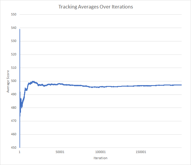 It seems we can get a fairly good idea of the average score after about 100,000 runs. The curve is not as smooth at iteration 200,000 as I would have thought, but I think we can confidently say that the average after 100,000 runs should be within ±2 of the true average score, which seems to be around 497.