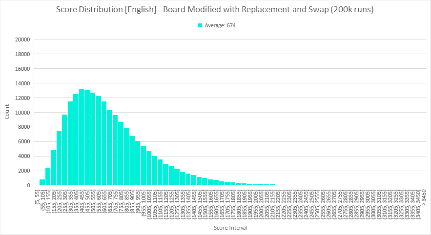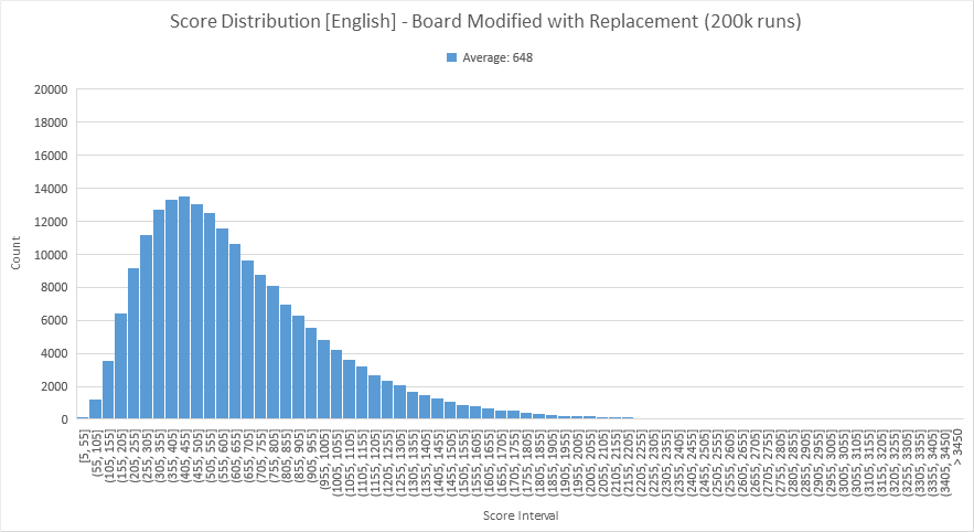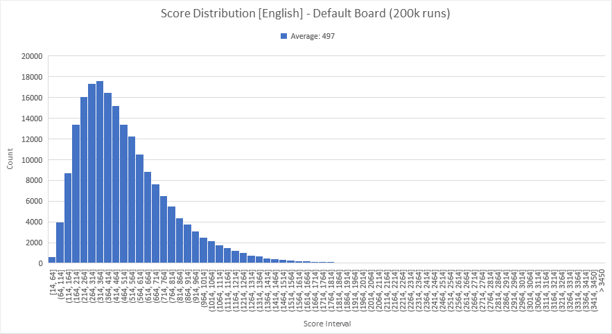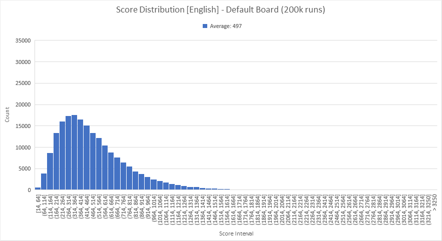 So what happens if we naively switch to a French lexicon without modifying the cubes? Running another 200,000 runs showed an average score of 270. This is likely due partly to lexicon size (280k words in the English CSW19, but only 200k words in the French ODS5), but also due to the letter distribution being tailored towards the English language. We'll dive into a more thorough analysis shortly.